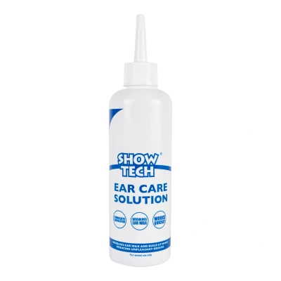 Show Tech Ear Care Solution 250ml When caring for and grooming your dog, it is important to also think about his or her ears. Ear problems are one of the most common ailments in dogs and frequent ear care is essential to prevent this. Not sure what product to use? The Show Tech Ear Care Solution makes cleaning ears easy-peasy! Easy-peasy ear cleaning This is not only an important product for dog owners, but also a must-have for you as a groomer to use in your grooming shop. With a good ear care, you give the best service to your customers. With its formula based on essential oils, the Ear Care Solution naturally loosens and dissolves ear wax, helping to remove excess build-up and keep the ears clean. This fantastic, cleansing product guarantees clean, healthy ears and reduces odours and the possibility of an ear infection. Cleaning the ears will be quicker and more efficient, which makes the whole grooming process more pleasant for both pet and groomer. Say hello to squeaky-clean ears and a happy, healthy dog! It’s all in the details Guarantees clean, healthy ears Reduces odours and the possibility of an ear infection Efficient, quick and safe ear cleaner Content: 250 ml Use instructions You can use Ear Care Solution for daily maintenance, but not if the ears are red and sore, or seem infected. In this case, we advise you to consult your vet. Apply the product in the dog’s ear while squeezing the bottle of Ear Cleaning Solution until the ear canal is full of product. Massage gently at the base of the ear for about 30 seconds and let the product dissolve the dirt. Then, remove visible dirt with a large cotton bud soaked in the cleaning solution and the outer part of the ear canal with a Show Tech Ear Wipe. Ear wax and other dirt can stick to the hair in the dog’s ear and thus prevent oxygen from circulating in the ear. To prevent infections, we recommend plucking the hair from the inside of the ear.