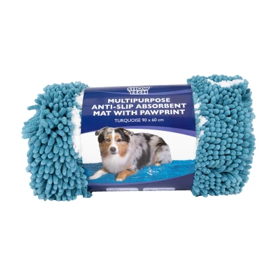 Show Tech Multipurpose Anti-Slip Absorbent Mat Dogs are our best friends, but they can also sometimes make a mess of your home or workspace, and are great at spreading hair, mud, water and urine. These multifunctional mats are a must-have for any dog lover who likes to keep his home or workplace clean. Versatile Show Tech Multipurpose Mats are ideal for your car, bathroom or any other room in your house, grooming salon, kennel or practice. Because they are made of a special polyester microfibre, they are much more absorbent than regular mats and absorb dirt, mud, urine and water like a sponge. In addition, the Show Tech Multipurpose Absorbent Mat has a durable non-slip bottom layer. Due to its excellent quality, it has a much longer lifespan than other mats on the market. These high-quality mats are truly multifunctional! You can use them as dog beds, but they can also serve as luxurious bath mats or even as door mats to keep out mud and dirt. They are perfect as well for use in cars to keep out hair and dirt, in cages or waiting kennels and for puppies. Also very important: they are super easy to wash. The cute paw print shows everyone that you are a big animal lover and the beautiful colour adds a nice touch to any interior. Welcome everyone and keep your home or business clean with these multifunctional mats. It’s all in the details Absorbent mat with non-slip coating and canine paw print Easily absorbs up to 5 litres of water or moisture Many uses: suitable for every dog groomer, owner, breeder and veterinarian Material: microfibre of 85% polyester and 15% polyamide Washing instructions: easily washable in the washing machine at 60 degrees, may also be put in the dryer Available in different colours Dimensions: L 90 x W 60 cm