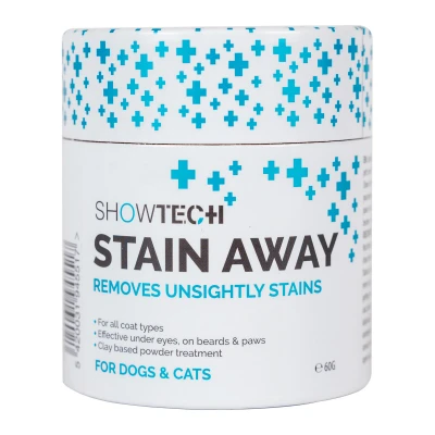 Show Tech+ Stain Away 60g Removes unsightly stains Looking to get rid of those reddish stains around your pet’s eyes? No need to search anymore, because we have got the perfect solution for you! The Show Tech+ Stain Away is a clay-based powder that helps you remove unsightly tear stains around the eyes, beard and paws in both dogs and cats. Its ingredients are natural and non-irritating, which makes this powder gentle yet effective. Apply sufficiently on a daily basis to the discoloured areas, taking care to avoid getting the powder in the eyes. You can use the Show Tech+ Magic Powder Brush. Dip the brush in the powder. Leave the product in the coat, brush it out the next day and apply again. Make sure that that the eyes are dry and that there are no crusts in the eyes. If this is the case, first clean them with the help of the Show Tech No More Tear Stains and Show Tech Face and Ear Comb. With regular use of this powder, existing stains will gradually become whiter and new ones will be avoided. You will be amazed at the results! If the eyes problems seem severe, there may be an underlying medical cause. In that case, we advise you to consult a veterinarian.