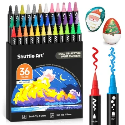 Shuttle Art Dual Tip Acrylic Paint Pens, 36 Colours Dot & Brush Marker Pens for Rock Painting, Ceramic, Wood, Fabric, Glass, Pen Set Kids Adults on Christmas Easter