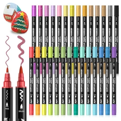 Shuttle Art Dual Tip Metallic Acrylic Paint Pens, 28 Colours Fine & Brush Marker Pens for Rock Painting, Ceramic, Wood, Fabric, Pen Set Kids Adults on Christmas Easter