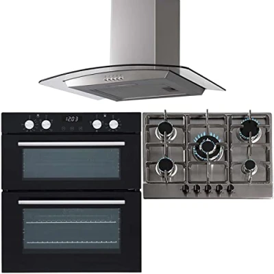 SIA 60cm Black Built Under Double Oven, 70cm 5 Burner Gas Hob & Curved Hood Fan