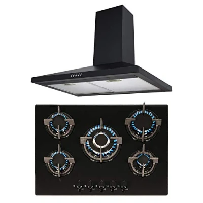 SIA 70cm Black 5 Burner Gas On Glass Hob & Chimney Kitchen Extractor Cooker Hood