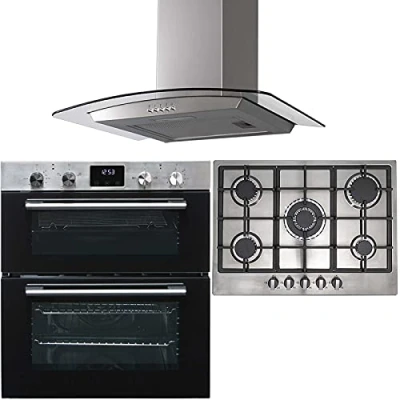 SIA DO111SS 60cm Stainless Steel Built Under Double Fan Oven, R6 70cm 5 Burner Gas Hob and Cast Iron Pan Stands & CGH60SS Curved Glass Cooker Hood