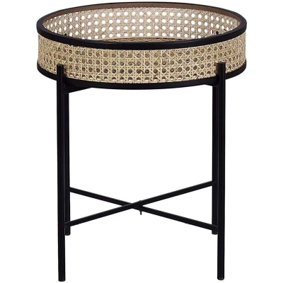 General description A nifty side table with a detachable serving tray, the Side Table VIENNA Black is a useful accessory for any living room. Although small, it provides the perfect place to rest your book, put away your cup, or store anything you like. The top is detachable and features a raised rim, allowing it to double as a serving board. When not in use, the table can be disassembled and folded to save space. Technical specifications Product Type: Side Table Style: Boho General Color: Natural, Beige, Black Main Material: Iron Additional Material: Rattan Legs Material: Metal Top Material: Rattan Shape: Round Finish: Matt Dimensions: Width: 36 cm, Length: 36 cm, Height: 43 cm Weight: 1 kg Weight Capacity: 3 kg Usage Detachable top can be used as a serving board. Blends well with any decor. Lightweight and easy to move. Other information Assembly Information: Does not require assembly. Maintenance tips: Metal - Clean with a mild cleaner and soft cloth, wipe dry afterwards; avoid