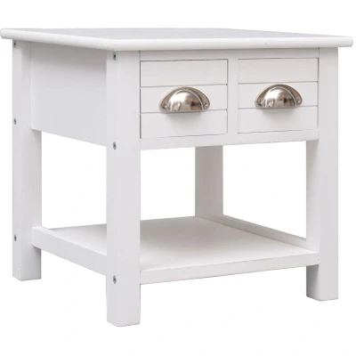 General description This wooden side table is a practical and decorative addition to your interior. It can serve multiple purposes, such as a telephone stand or a bedroom cabinet. Made from durable paulownia wood and MDF, this coffee table features a sturdy tabletop ideal for displaying decorative objects, photo frames, or potted plants. The table offers ample storage space with two drawers and a bottom shelf, and it is easy to clean with a damp cloth. Assembly is straightforward. Technical specifications Colour: White Material: Paulownia wood + MDF tabletop Dimensions: 40 x 40 x 40 cm (W x D x H) With 2 drawers Other information