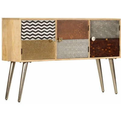 General description The wooden sideboard will make a timeless addition to your interior decor. Made of solid mango wood, it is highly stable and durable. Its sturdy top is ideal for placing decorative items such as vases or potted plants. The cabinet provides ample storage space for keeping your various items neatly organized, while its unique decorative patterns add to the sideboard's modern charm. The product is easy to assemble. Important note: The colors and grains of the wood may vary from piece to piece, making each piece unique and slightly different from the next. Technical specifications Material: Solid mango wood + steel Dimensions: 120 x 30 x 75 cm (W x D x H) With 3 compartments Polished, painted, and lacquered Other information