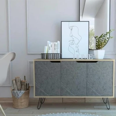 ManoManoGeneral description This 3 door sideboard is perfect for storage, featuring one large cupboard and one small cupboard, both equipped with shelves. Finished in a smoked oak effect with contrasting bleached grey oak effect doors, this unit is designed to maximize limited space in any room. The handles are seamlessly integrated into the doors, maintaining a sleek and clean aesthetic, while the metal hairpin style legs add a contemporary touch. Technical specifications Width: 117 cm Depth: 38 cm Height: 76 cm Usage This sideboard is ideal for storing tableware, glassware, and other essentials for entertaining at home. Its large surface area is perfect for displaying collectibles or accommodating a lamp, making it a versatile addition to your lounge, dining room, or kitchen.