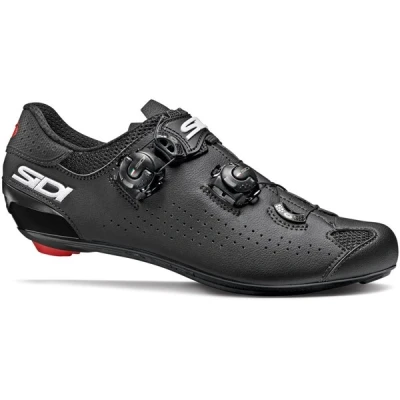 The SIDI Genius 10 road cycling shoe Incorporates features of resistance, stability, lightness, transpirability, water-repellency and eco-friendliness. It is manufactured using the “Water-Tech” water treatment. Lower environmental impact, less noxious emissions into the air and into the work environment and the fact that not solvents, but water-based products were used, is beneficial to the environment as well as the final user.SIDI’s TECHNO-3 SYSTEM dials in fit along the entire length of the shoe, adapting the upper to the shape of the foot for a customized fit. SIDI’s famously reliable and replaceable closures are improved by an all new proprietary SIDI Wire material that is completely non-binding for intuitive and effortless on-the-fly adjustments. Like most SIDI small parts, the TECNO-3 BUCKLE is serviceable and replaceable.The reinforced heel keeps the foot in a optimal position and avoids the shoe being deformed by extreme performance or prolonged pressure.For walkability, Sidi cycling shoes include a replaceable polyurethane heel pad.The CARBON COMPOSITE 20 SOLE is in nylon and injected carbon fiber. The nylon keeps the technical features unchanged over time. The result is a light and stiff sole. The central part of the sole is graduated, with millimetric scale, to facilitate the correct fixing of the cleats. Equipped with replaceable polyurethane heel.