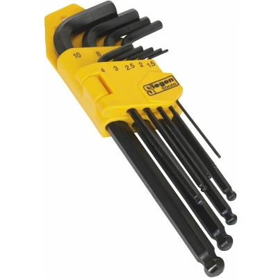 ManoManoGeneral description Manufactured from heat-treated and hardened Chrome Vanadium steel with a blackened finish, the Siegen Ball-end Hex Key Set includes 9 pieces of long metric keys. The ball-end design allows for driving fixings at angles of up to 30 degrees, making it a versatile tool for various applications. The set is supplied in an easy-access case with a hanging tag for safe storage and quick key selection. Technical specifications Material: Heat-treated Chrome Vanadium steel Finish: Blackened for corrosion resistance Key lengths: 75mm to 180mm Key sizes: 1.5mm to 10mm MPN: S01093 EAN: 5054511027396 Usage The ball-end hex keys are ideal for use in tight spaces and allow for easy access to fasteners at an angle, making them suitable for various DIY and home improvement projects. Other information