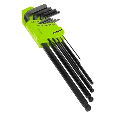 General description Siegen Ball-end Hex Key Set includes 9 extra long imperial keys, designed for ease of use and accessibility. The ball-end feature allows the keys to drive fixings at angles of up to 30 degrees, making them versatile for various applications. This set is part of the Siegen by Sealey range, known for quality tools at competitive prices. Technical specifications Material: Heat treated and hardened Chrome Vanadium steel Finish: Blackened Key lengths: 90mm to 230mm Key sizes: 1/16 to 3/8 Compatibility and accessories Supplied in an easy-access case with a hanging tag for safe storage and quick key selection Other information MPN: S01099 EAN: 5054511030495 Lifetime guarantee*