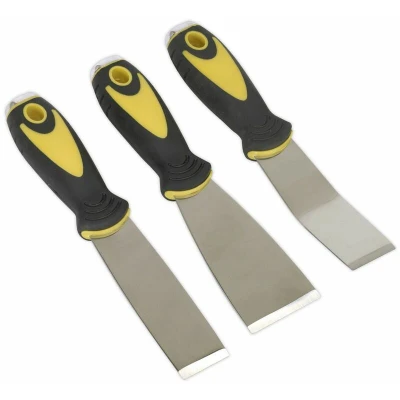 General description Sealey Scraper Set with Hammer Cap includes three essential scrapers: 32mm, 50mm, and a 32mm angled scraper (20°). Designed for versatility, this set is ideal for various workshop and bodyshop applications, including gasket scraping and windscreen preparation. The ultra-stiff stainless steel blades ensure durability and effectiveness in scraping tasks. Technical specifications Blade thickness: 1.8mm Includes scrapers: 32mm, 50mm, 32mm angled (20°) Manufacturer Part Number (MPN): S0856 EAN: 5051747512566 Usage The scrapers are designed for careful use, especially with the hammer cap that allows for controlled striking. The soft grip handles provide comfort and maximum control during use. Other information