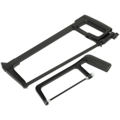 ManoManoGeneral description Sealey Siegen Engineer's Hacksaw Set includes a 2-piece set comprising a 300mm engineer's hacksaw and a 150mm junior hacksaw. Both saws are designed for comfortable and accurate cutting, making them ideal for various DIY and home improvement tasks. Technical specifications Model No.: S0865 Engineer’s hacksaw length: 300mm Junior hacksaw length: 150mm Material: Carbon steel blade Compatibility and accessories Both saws are suitable for cutting a variety of materials. Installation Multi-position clamp allows the blade to be mounted at different angles (45° and 90°). Usage Designed for comfortable and accurate cutting. Other information