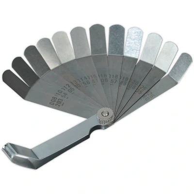 ManoManoGeneral description Siegen Feeler Gauge 12 Blade Offset is an essential tool for precision measurement, featuring dual markings in both Imperial and Metric units. The offset tips are specifically designed for checking tolerances on Overhead Cam (OHC) configurations and are suitable for various applications where straight blades cannot be used. Technical specifications Blade sizes: 0.008 to 0.026 inches (0.203 to 0.660 mm) Blade dimensions: 95 x 13 mm (with a 45º-25º offset) Manufacturer Part Number (MPN): S0516 EAN: 5024209689113 Other information