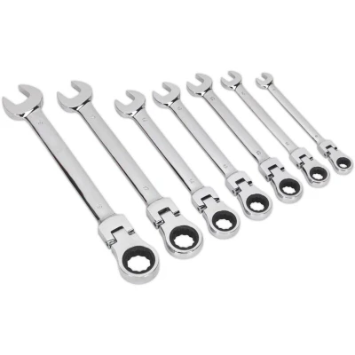 ManoManoGeneral description Sealey Siegen Flexi-Head Combination Ratchet Spanner Set includes a 7-piece set made from durable Chrome Vanadium steel. This set features a flexi-head design and a 72-tooth ratchet mechanism that requires only a 5° rotation to engage the next tooth, making it ideal for use in tight spaces. The spanners are supplied in a secure EVA foam storage tray for convenient organization and protection. Technical specifications Material: Chrome Vanadium steel Sizes: 8mm, 10mm, 12mm, 13mm, 14mm, 17mm, 19mm Ratchet mechanism: 72-tooth Rotation required: 5° Other information Lifetime guarantee* Part of the Siegen by Sealey range of quality tools at competitive prices