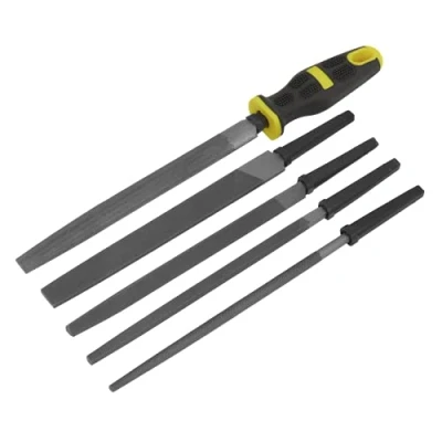 AmazonPopular set of assorted second cut coarse files with interchangeable comfort grip handle. Each file is double cut for faster removal of material from workpiece. Contents: Half-Round, Round, Square, 3-Square, Flat., Weight: 1.68433168168 pounds, Manufacturer: Sealey