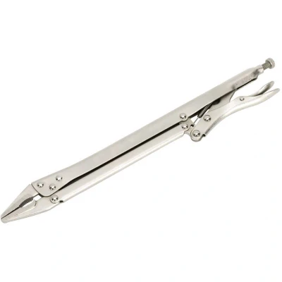 ManoManoGeneral description Sealey Siegen Extra-Long Locking Pliers are designed for use in areas with limited access. With a length of 375mm, these pliers feature deeply serrated, adjustable grip jaws and a lever release mechanism, making them a reliable tool for various applications. Technical specifications Material: Drop-forged and heat treated steel Finish: Bright nickel plate Jaw Capacity: 50mm Model No.: S0841 EAN: 5051747484665 Other information