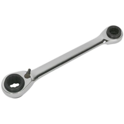 The Sealey Siegen 4-in-1 Reversible Ratchet Ring Spanner is an essential addition to any toolkit, delivering versatility and convenience without compromising on quality. Manufactured from top-grade Chrome Vanadium steel, this spanner is both hardened and tempered, ensuring exceptional durability and a glossy, polished finish that resists wear and corrosion.