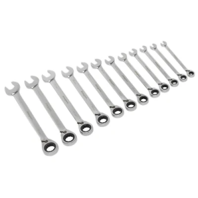 AmazonChrome Vanadium steel reversible ratchet Combination Spanner Set. 72-Tooth ratchet ring and gear set requiring only 5º rotation to pick up the next tooth, ideal for applications where space is limited. 15º offset keeps knuckles clear of obstructions. Sizes: 8, 9, 10, 11, 12, 13, 14, 15, 16, 17, 18, 19mm. Supplied in storage rack., Weight: 1770.0 grams, Manufacturer: Sealey