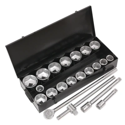 ManoManoGeneral description Sealey Siegen Socket Set 1" Sq Drive 21pc is a comprehensive toolset designed for durability and efficiency. Made from heat-treated, drop-forged Chrome Vanadium steel, this set features fully polished chrome plating for enhanced corrosion resistance. It includes WallDrive® sockets, a ratchet wrench with twist-reverse, extension bars, and a sliding T-bar, all conveniently supplied in a sturdy metal storage case. Technical specifications Material: Heat treated, drop-forged Chrome Vanadium steel Finish: Fully polished chrome plating Contents: 21 pieces including 6-Point Standard Sockets (sizes: 36, 38, 41, 46, 50, 54, 55, 58, 60, 63, 65, 67, 70, 71, 75, 77, 80mm), Extension Bars (200mm, 400mm), Sliding T-Bar, 1" Sq Drive Ratchet Wrench Model No.: S0768 EAN: 5024209949880 Other information