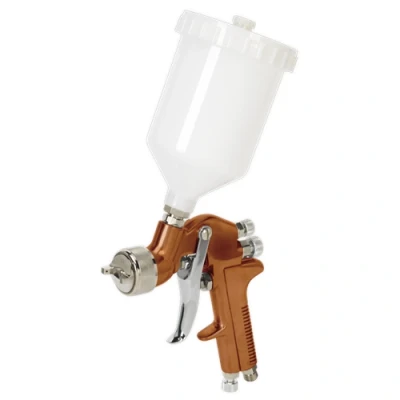 • High quality professional gravity fed spray gun, ideal for automotive refinishing.• 2-Stage trigger control and 600ml plastic gravity feed pot.• Adjustable spray width and fluid flow.• Supplied with a 1.3mm set-up. • Suitable for use with water based paints.• Maintenance tools supplied.• Alternative set-ups available separately.Gravity feed spray gun, ideal for automotive refinishing. 2-Stage trigger control. Adjustable spray width and fluid flow. Suitable for use with water based paints. Maintenance tools supplied. Alternative set-ups available separately.Technical Specification:Air Consumption: 12-15cfmAvailable Set-Up(s): 1.5, 1.8, 2mmNett Weight: 0.90kgPot Capacity: 600mlRecommended Air Pressure: 30-70psiStandard Set-Up: 1.3mmDimensions: Length: 147mm x Height: 136mmWeight: 0.91KgWarranty: 1 year