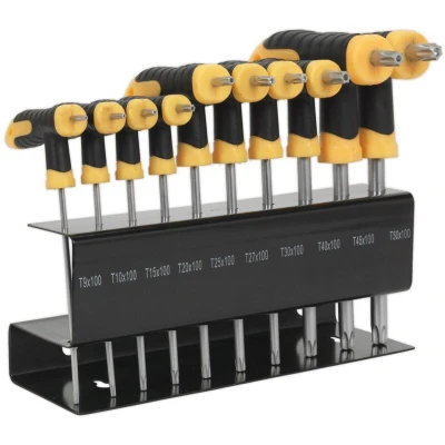 ManoManoGeneral description SEALEY TORX KEY SET TRX STAR 10PC T HANDLE ALLEN KEY ALLAN HEX WRENCH is a heavy-duty tool set designed for durability and comfort. The set features hardened and tempered Chrome Vanadium steel shafts with a polished satin finish, ensuring long-lasting performance. Each handle incorporates both a long TRX-Star* and a short security TRX-Star* shaft, providing versatility for various applications. The set also includes a metal stand suitable for wall mounting, making it easy to store and access. Technical specifications Brand: SEALEY Contents: Security TRX-Star*/TRX-Star*; T9, T10, T15, T20, T25, T27, T30, T40, T45, T50 Length: 135-170mm Nett Weight: 0.38kg MPN: S01151 EAN: 5054511210996 Other information