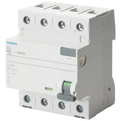 SENTRON RCD Circuit Breaker Number of pins: 4P Rated value: 30 mA Current / at AC / rated value: 63 A Supply voltage at AC / rated value: 400 V