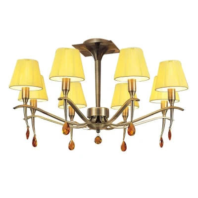 The Siena Semi Flush Round chandelier features six lights with amber cream shades, all set in antique brass. Its unique design provides a warm glow that enriches any room's ambiance.