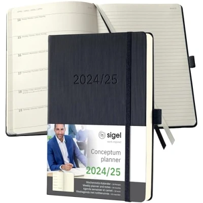 The Conceptum planner keeps you up-to-date during the working day. This is where classy design combines with practical features to provide you with a professional companion throughout the year. Also ideal as a personal organiser. Organise with confidence - with the elegant Conceptum Weekly planner and notes for 2024/2025 (calendar: 2 pages = week on left/notes on right, DE/GB/FR/NL) in approx. A5 format (14,8 x 21,3 cm) with 256 pages (including 18 perforated pages). The sturdy hardcover in black guarantees a firm writing surface. The elegant design of the international award-winning Conceptum range with a grooved Softwave surface - for a unique look and feel | High-quality stitched binding allows the book to lie completely flat when open and ensures a long product lifespan Chamois-coloured paper (80 gsm, PEFC-certified), printed in classy grey | Monthly and annual overview, public holidays (D/AT/CH/UK/FR/BE/NL), overview of school holidays (DE/AT/CH/NL), units of measurement (EU/UK/US), a map of international time zones Elastic fastener, pen loop, quick pocket, archive pocket, 2 ribbon markers