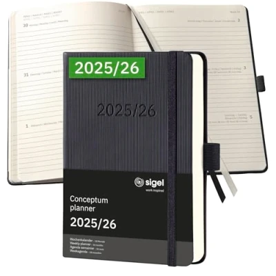 SIGEL C2602 Weekly Planner Calendar 2025/2026, Approx. A6, Black, Hard Cover, Elastic Band, Pen Loop, Archive Pocket, Made of Sustainable Paper, 18 Month Calendar, Book Conceptum