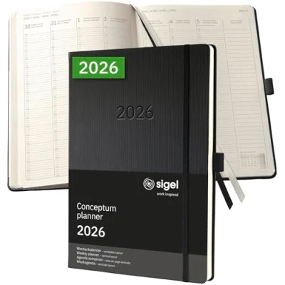 SIGEL C2618 Planning Book Weekly Planner Calendar 2026, Extra Large, A4+, 1 Week = 2 Pages, Column per Day, Black, Hard Cover, 192 Pen Loop, Archive Pocket, Conceptum