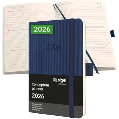 The Conceptum planner keeps you up-to-date during the working day,This is where classy design combines with practical features to provide you with a professional companion throughout the year Organise with confidence - with the elegant Conceptum Weekly planner for 2026 (calendar: 2 pages = 1 week, DE/GB/FR/NL) in approx A6 format (9,30 x 14 x 1,40 cm) with 176 pages (including 18 sheets perforated pages) Thanks to the flexible soft cover in dark blue, the planner fits easily into any pocket The elegant design of the international award-winning Conceptum range with a grooved Softwave surface - for a unique look and feel High-quality stitched binding allows the book to lie completely flat when open and ensures a long product lifespan Chamois-coloured paper (80 gsm, PEFC-certified), printed in classy grey; Monthly and annual overview, public holidays (D/AT/CH/UK/FR/BE/NL), overview of school holidays (DE/AT/CH/NL), units of measurement (EU/UK/US), a map of international time zones