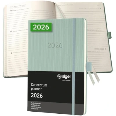 The Conceptum planner keeps you up-to-date during the working day,This is where classy design combines with practical features to provide you with a professional companion throughout the year Organise with confidence - with the elegant Conceptum Weekly planner for 2026 (calendar: 2 pages = 1 week, DE/GB/FR/NL) in approx A5 format (14,80 x 21,30 x 2 cm) with 192 pages (including 18 sheets perforated pages) The sturdy hardcover in mint green guarantees a firm writing surface The elegant design of the international award-winning Conceptum range with a grooved Softwave surface - for a unique look and feel High-quality stitched binding allows the book to lie completely flat when open and ensures a long product lifespan Chamois-coloured paper (80 gsm, PEFC-certified), printed in classy grey; Monthly and annual overview, public holidays (D/AT/CH/UK/FR/BE/NL), overview of school holidays (DE/AT/CH/NL), units of measurement (EU/UK/US), a map of international time zones