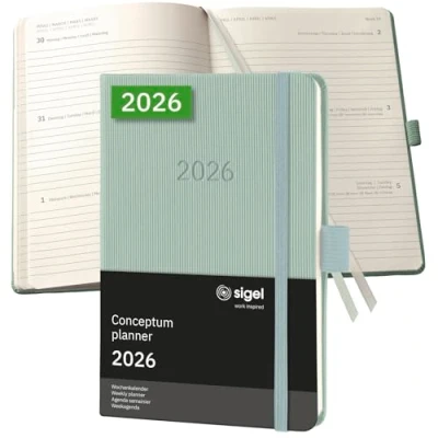 The Conceptum planner keeps you up-to-date during the working day,This is where classy design combines with practical features to provide you with a professional companion throughout the year Organise with confidence - with the elegant Conceptum Weekly planner for 2026 (calendar: 2 pages = 1 week, DE/GB/FR/NL) in approx A6 format (10,80 x 15,10 x 2 cm) with 176 pages (including 18 sheets perforated pages) The sturdy hardcover in mint green guarantees a firm writing surface The elegant design of the international award-winning Conceptum range with a grooved Softwave surface - for a unique look and feel High-quality stitched binding allows the book to lie completely flat when open and ensures a long product lifespan Chamois-coloured paper (80 gsm, PEFC-certified), printed in classy grey; Monthly and annual overview, public holidays (D/AT/CH/UK/FR/BE/NL), overview of school holidays (DE/AT/CH/NL), units of measurement (EU/UK/US), a map of international time zones