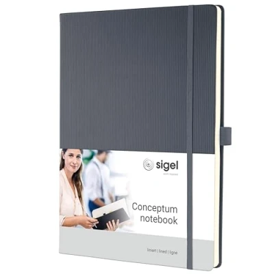 Conceptum business notebooks combine the best design and excellent quality; Many practical features such as the page numbering help you to organize yourself Large notebook, lined, approx DIN A4 (21,3 x 29,5 cm) in dark grey, with 194 numbered pages (20 of which are perforated sheets) BEST DESIGN: Grooved softwave surface – unique to the touch and also visibly special; With high-quality chamois-colored 80g paper (PEFC-certified) EXCELLENT QUALITY: stable and hard-wearing hardcover; Manufactured using classic thread stitching for durability and perfect flatness of the book PRACTICAL FEATURES: table of content, page numbers, 20 perforated sheets, elastic fastener, pen loop, 2 page markers, quick pocket, archive pocket, adhesive labels for the front cover and spine