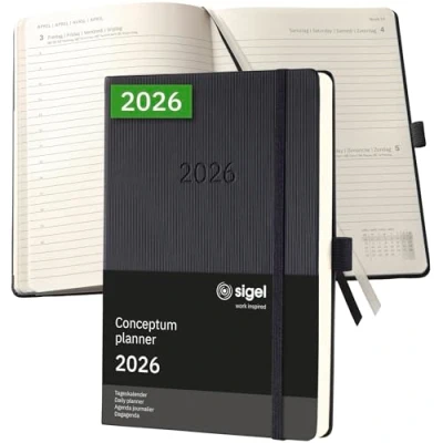 The Conceptum planner keeps you up-to-date during the working day,This is where classy design combines with practical features to provide you with a professional companion throughout the year Organise with confidence - with the elegant Conceptum Daily planner for 2026 (calendar: 1 page = 1 day, DE/GB/FR/NL) in approx A5 format (14,80 x 21,30 x 3 cm) with 400 pages (including 18 sheets perforated pages) The sturdy hardcover in black guarantees a firm writing surface The elegant design of the international award-winning Conceptum range with a grooved Softwave surface - for a unique look and feel High-quality stitched binding allows the book to lie completely flat when open and ensures a long product lifespan Chamois-coloured paper (80 gsm, PEFC-certified), printed in classy grey; Monthly and annual overview, public holidays (D/AT/CH/UK/FR/BE/NL), overview of school holidays (DE/AT/CH/NL), units of measurement (EU/UK/US), a map of international time zones
