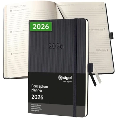 The Conceptum planner keeps you up-to-date during the working day,This is where classy design combines with practical features to provide you with a professional companion throughout the year Organise with confidence - with the elegant Conceptum Weekly planner for 2026 (calendar: 2 pages = 1 week, DE/GB/FR/NL) in approx A5 format (14,80 x 21,30 x 2 cm) with 192 pages (including 18 sheets perforated pages) The sturdy hardcover in black guarantees a firm writing surface The elegant design of the international award-winning Conceptum range with a grooved Softwave surface - for a unique look and feel High-quality stitched binding allows the book to lie completely flat when open and ensures a long product lifespan Chamois-coloured paper (80 gsm, PEFC-certified), printed in classy grey; Monthly and annual overview, public holidays (D/AT/CH/UK/FR/BE/NL), overview of school holidays (DE/AT/CH/NL), units of measurement (EU/UK/US), a map of international time zones