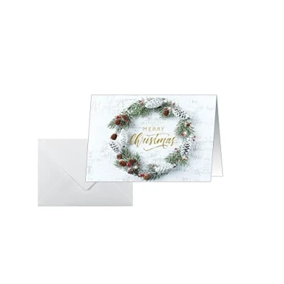 These Sigel Christmas greeting cards are without text inside - so you can print or write on them individually Christmas cards "Christmas wreath" (design: Christmas wreath in white/green/gold) in A6 format (250 g/m², 25 cards made of white card), includes 25 matching rubberised envelopes Sustainable: made in Germany and FSC certified: high-quality, environmentally friendly paper from responsible sources Efficient to print (cards are delivered unfolded) and suitable for all inkjet and laser printers as well as copiers - and of course for labelling by hand Folding cards for your Christmas post, as an invitation or Christmas menu card
