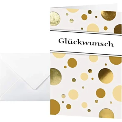 Neutral greeting cards "Golden Bubble" in modern look with gold and beige dots, finished with gold embossing Cards made of glossy card 220 g/m2 (matte inside), with white envelopes C6 (gummed) Suitable for all inkjet and laser printers and photocopiers FSC certified: paper from responsible sources. Made in Germany Ideal as a birthday card, wedding card, anniversary card and other occasions
