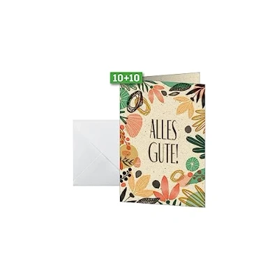 Greeting cards "Colourful plants" (design: flowers and leaves in golden yellow, green, red, rose, black) in A6 format (grass paper, 240 g/m², 10 cards). Includes 10 matching rubberised envelopes The modern greeting cards are blank inside and therefore versatile: for good wishes for birthdays, weddings, births, farewell, retirement or anniversaries Printed on environmentally friendly grass paper: very good to print and write on, absolutely sustainable in production Made in Germany | FSC certified: high-quality, environmentally friendly paper from responsible sources The cards are delivered opened: so the blank inner pages can be easily printed with inkjet, laser printer or copier - or written on by hand