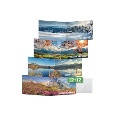 Greeting cards "Mountain landscapes by seasons" (design: mountain landscapes by seasons) in A6 format (gloss cardboard, 300 g/m², 12 cards), 3 cards each with 4 different motifs, includes 12 matching rubberised envelopes The modern greeting cards are blank inside and therefore versatile: for good wishes for birthdays, weddings, births, farewell, retirement or anniversaries FSC certified: with environmentally friendly paper from responsible sources. Made in Germany The cards are delivered opened: so the blank inner pages can be easily printed with inkjet, laser printer or copier - or written on by hand