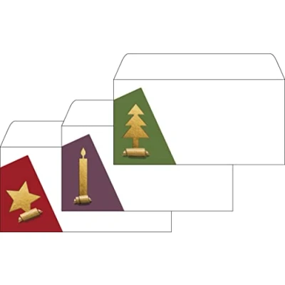 For a special Christmas message that you can customise and print yourself. Stylish Christmas envelopes "Cut-out style" (Motif: 9x star, 8x tree, 8x candle in White, Red, Green) in the DL format, 25 Pieces | with a gummed flap. Made in Germany | Contemporary, minimalist design Paper with a smooth surface and high degree of Whiteness for pin-sharp lettering | Suitable for all inkjet and laser printers and copiers, or to write on by hand Inner print prevents the contents from showing through | Discover all the other designer products in the Cut-Out-Style (Collection comprises writing paper, envelopes, cards, gift bags and gift wrap.) collection.