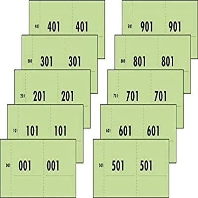 Tickets numbered 1 - 1000; green; 53 x 105 mm; 10 x 100 sheets Dutch numbered tickets Suitable as cloakroom numbers, cake blocks, tokens, food tokens or for raffles Thanks to the excellent cut-bar perforations, every sheet and every tear can be quickly and clean separation from recycled paper