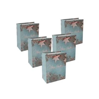 SIGEL GT124 Gift Bag Small Blue/Copper Christmas Stars with Base Insert and Colour Coordinated Silk Ribbon Handles Plastic, White Cardboard 18 x 23 10 cm Pack of 5