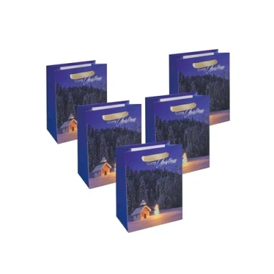 SIGEL GT128 Gift Bag Small Blue Winter Landscape with Base Insert and Colour Coordinated Silk Ribbon Handles Plastic, White Cardboard 18 x 23 10 cm Pack of 5
