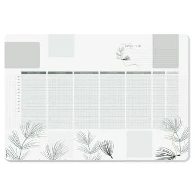 This paper desk pad 'Weekly Planner Nature' with non-dated weekly calendar and rounded corners, DE/EN/FR/NL, allows you to organize yourself perfektly IDEAL SIZE : large paper desk mat in format DIN A2 (59,5 x 41 cm) with 30 detachable sheets - protects the table surface from scratches, stains and abrasion HIGH QUALITY : high quality detachable paper (80 g/m²) - Made in Germany COMPLETE FLATNESS: The corners do not bend due to the gluing at the foot and at the top of the page; The solid cardboard back (600 g/m²) underlines the perfect flatness and ensures great writing comfort LOTS OF SPACE: For your notes and creativity