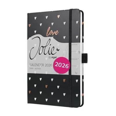This diary is your colourful, exclusive companion for the whole year Elegant design meets practical features which enable perfect organisation in both your private and professional life Organise in style - with the popular Jolie weekly diary for 2026 (calendar: 2 pages = 1 week, DE/GB/FR/NL) in approx, A5 format (13,50 x 20,30 x 1,60 cm) with 174 pages (including 12 sheets perforated pages), The sturdy hardcover in black guarantees a firm writing surface Trendy cover design with a high-quality finish for stunning effects Extremely durable due to the high-quality stitched binding White paper (80 gsm, FSC-certified), printed in classy grey; Numerous pages with information, motifs and planning templates: monthly and annual overview (only EN), school and public holidays (DE/AT/CH/UK/FR/BE/NL), table of measurements, travel destinations, birthdays, and much more besides