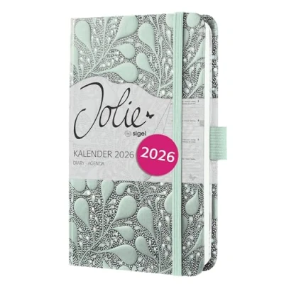This diary is your colourful, exclusive companion for the whole year Elegant design meets practical features which enable perfect organisation in both your private and professional life Organise in style - with the popular Jolie weekly diary for 2026 (calendar: 2 pages = 1 week, DE/GB/FR/NL) in approx, A6 format (9,50 x 15 x 1,60 cm) with 174 pages (including 12 sheets perforated pages), The sturdy hardcover in black/light green guarantees a firm writing surface Trendy cover design with a high-quality finish for stunning effects Extremely durable due to the high-quality stitched binding White paper (80 gsm, FSC-certified), printed in classy grey; Numerous pages with information, motifs and planning templates: monthly and annual overview (only EN), school and public holidays (DE/AT/CH/UK/FR/BE/NL), table of measurements, travel destinations, birthdays, and much more besides