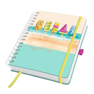 This spiral pad is ideal for people who love creating their own personal holiday diary, It is a stylish modern notebook that also enables you to add creative flourishes when planning a journey Become a hand lettering professional - with the attractive Jolie spiral notebook "Summer Breeze" in approx A5 format (16,80 x 21,50 x 2,80 cm) with 240 pages (dotted (dot grid), 120 gsm, all pages are perforated),The sturdy hardcover in pink/sandbrown/yellow/aquamarine guarantees a firm surface for writing and drawing Stylish cover design with a high-quality motif print and embossing is pleasant to the touch Durable due to the sturdy cover and high-quality metal ring binding White paper (FSC-certified) with dotted ruling and rounded corners, ideal for creative trends such as hand lettering and bullet journaling; Practical insert pocket for the safekeeping of pictures, notes, etc