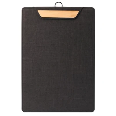 Designed for use e.g. in catering establishments for presenting menus that change frequently, this high-quality clipboard is also ideal for doctors' surgeries or clinics, or as a stand-up display for countertops in a wide range of establishments such as beauty salons, car showrooms, etc. Menu clipboard made of recycled polyethylene (RPET), bamboo, dark grey/beige, with the dimensions 23 x 33 x 1 cm, for the A4 format. A concealed magnetic clip holds up to 20 sheets; With additional hook at the top for hanging; Practical stand-up feature: can be used standing at an angle or lying flat on the table Durable material (without softening agent), resistant to scuffing, scratches and general wear and tear Stackable and space-saving